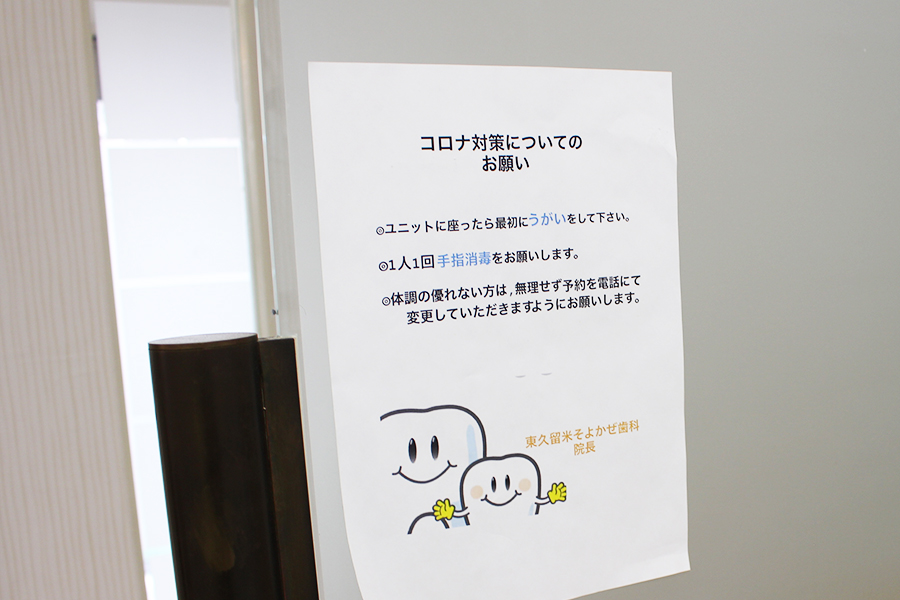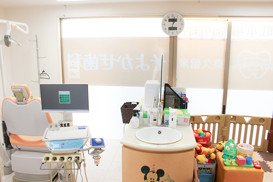東久留米市の歯科「東久留米そよかぜ歯科」の院内の様子や設備についてご紹介します。 患者様がリラックスして治療を受けられるよう、明るく開放的な空間をご提供いたします。 診療室は患者様のプライバシーに配慮した作りとなっており、安心して治療を受けていただけます。診察室1にはキッズスペースを隣接しています。小さなお子様連れでも安心してご来院ください。駐車場は敷地内に専用駐車場、徒歩数秒のところに提携駐車場がありますのでお車でお越しの際にはご活用ください。